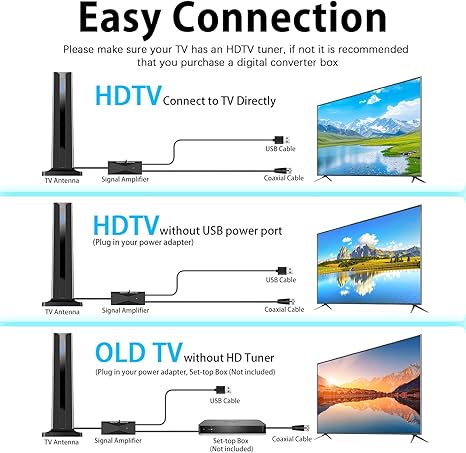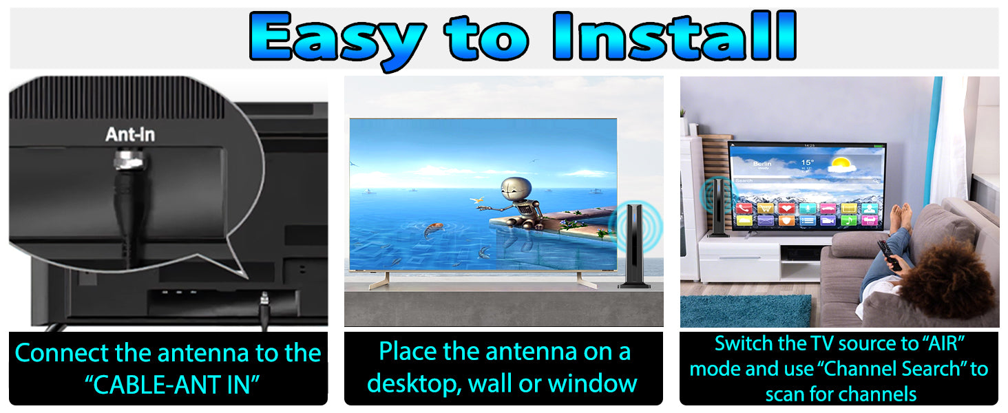 Diese digitale TV-Antenne ist mit einem Signalverstärker ausgestattet, um einen erstaunlichen 1080P- und 4K-HDTV-Empfang zu ermöglichen und höchste Qualität, ultrascharfe Bilder und eine stabile Wiedergabe zu gewährleisten.