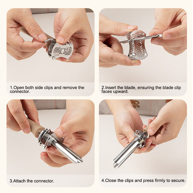 STORAGE DESIGN - Die Klinge des Schälmessers kann leicht entfernt werden und die Klinge kann sicher im Inneren des Schälers aufbewahrt werden, um zu verhindern, dass die Klinge freigelegt wird und die Sicherheit zu verbessern.