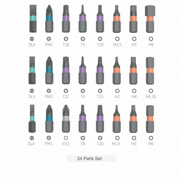 24 Schraubendreherbits aus legiertem S2-Chrom-Molybdän-Stahl in Industriequalität, kontinuierliche Wärmebehandlung. 5 Arten von Schraubendreherköpfen, um die Bedürfnisse des professionellen Einsatzes, Leben zu Hause, Arbeit, DIY und Wartung zu erfüllen. Arbeitssparendes 6,2-Grad-Ratschendesign, 58-Zähne-Ratschenstruktur mit positiver und negativer Rotation, spart 80% Kraftaufwand.