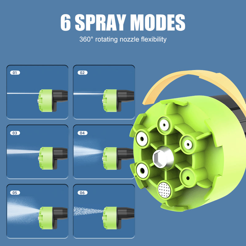 6 SPRÜHMODI – Mit einer um 360° drehbaren Düse und sechs Sprühmodi passt sich die Waschpistole sofort an unterschiedliche Reinigungsanforderungen an. Von einem schmalen Strahl für hartnäckigen Schmutz bis hin zu einem breiten Sprühstrahl für größere Flächen können Benutzer die Modi bequem mit einer Hand umschalten. Diese Flexibilität sorgt für Präzision und Vielseitigkeit in jeder Reinigungssituation.