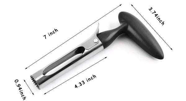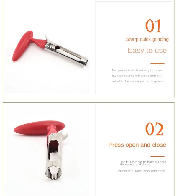 Unser Apfelentkerner verfügt über ein anständiges Design mit zwei Klingen mit scharfen gezackten Spitzen und einem ergonomischen Griff. Er hilft Ihnen, Früchte mit einer einfachen Bewegung perfekt zu entkernen.