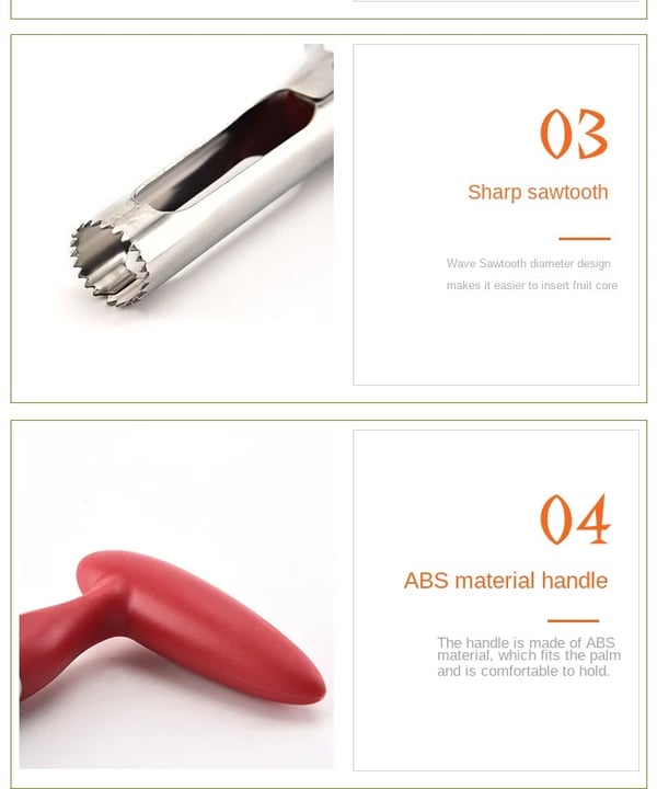 Material: Der Apfelentkerner ist aus rostfreiem Stahl + ABS-Kunststoff.
