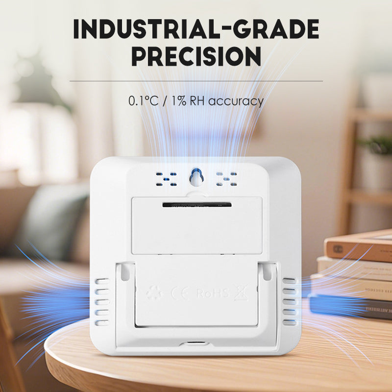 INDUSTRIELLE GENAUIGKEIT: Ausgestattet mit einem hochpräzisen digitalen Sensor, der Temperaturschwankungen von 0,1 °C und Änderungen der relativen Luftfeuchtigkeit von 1 % erfasst. Zwei Lufteinlässe und eine industrielle Kalibrierung gewährleisten eine Fehlerfreiheit im Bereich von 40 % bis 70 % Luftfeuchtigkeit. Zuverlässige Leistung von -10 °C bis 55 °C und 10 % bis 99 % relativer Luftfeuchtigkeit, geeignet für alle Jahreszeiten.
