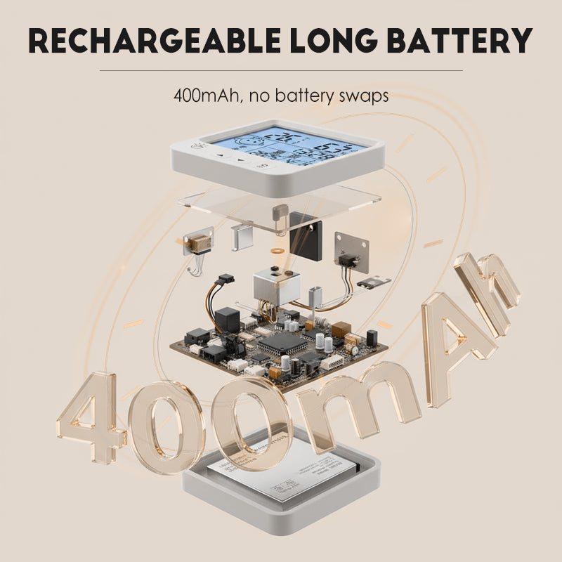 AUFLADBAR UND LANGLEBIG: Angetrieben von einer 400-mAh-Lithium-Batterie mit verbessertem Energiesparmodus. Über USB aufladbar mit Überladungsschutz, sodass häufige Batteriewechsel entfallen. Bietet einen längeren Betrieb für eine kontinuierliche Überwachung ohne Unterbrechung.